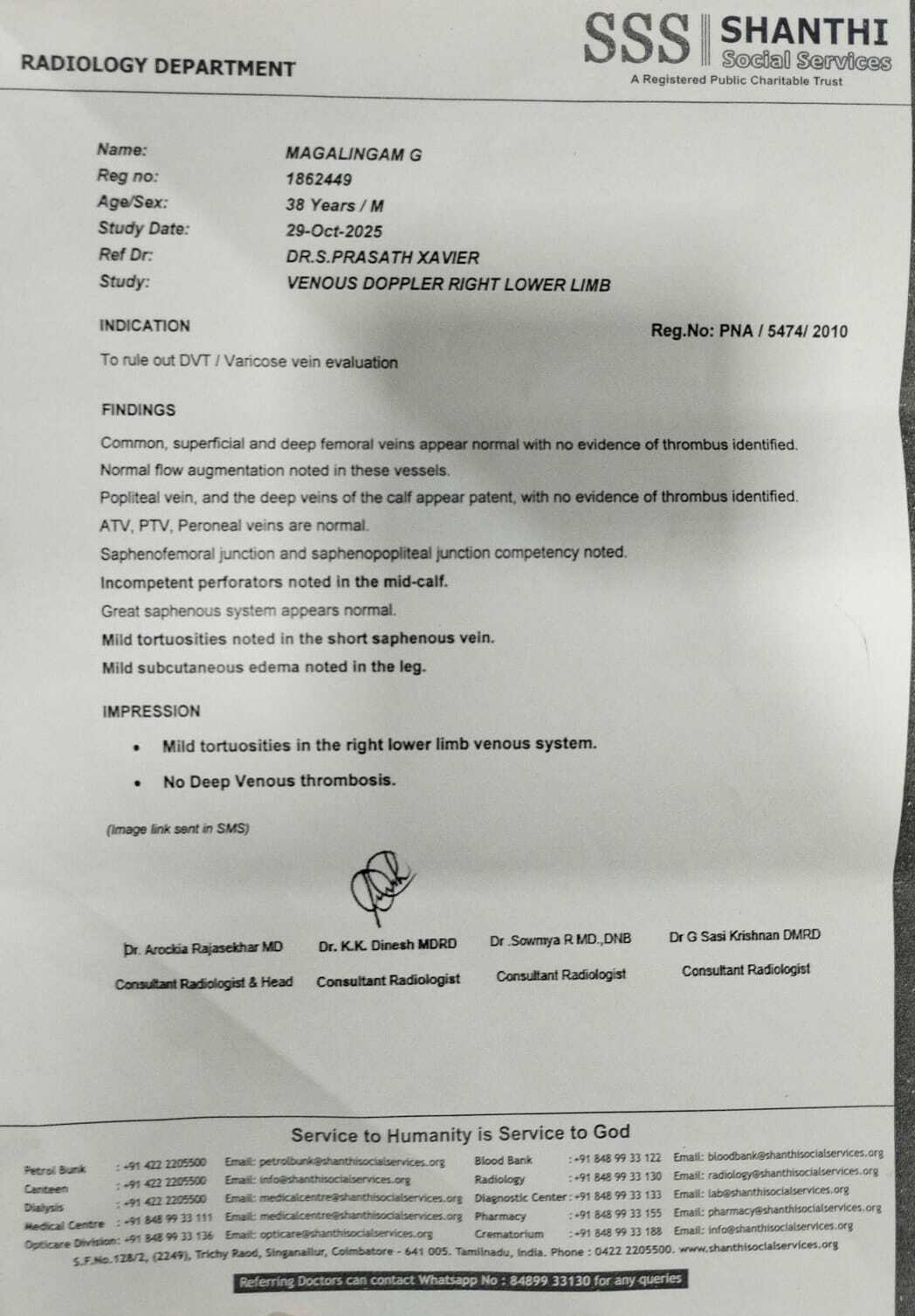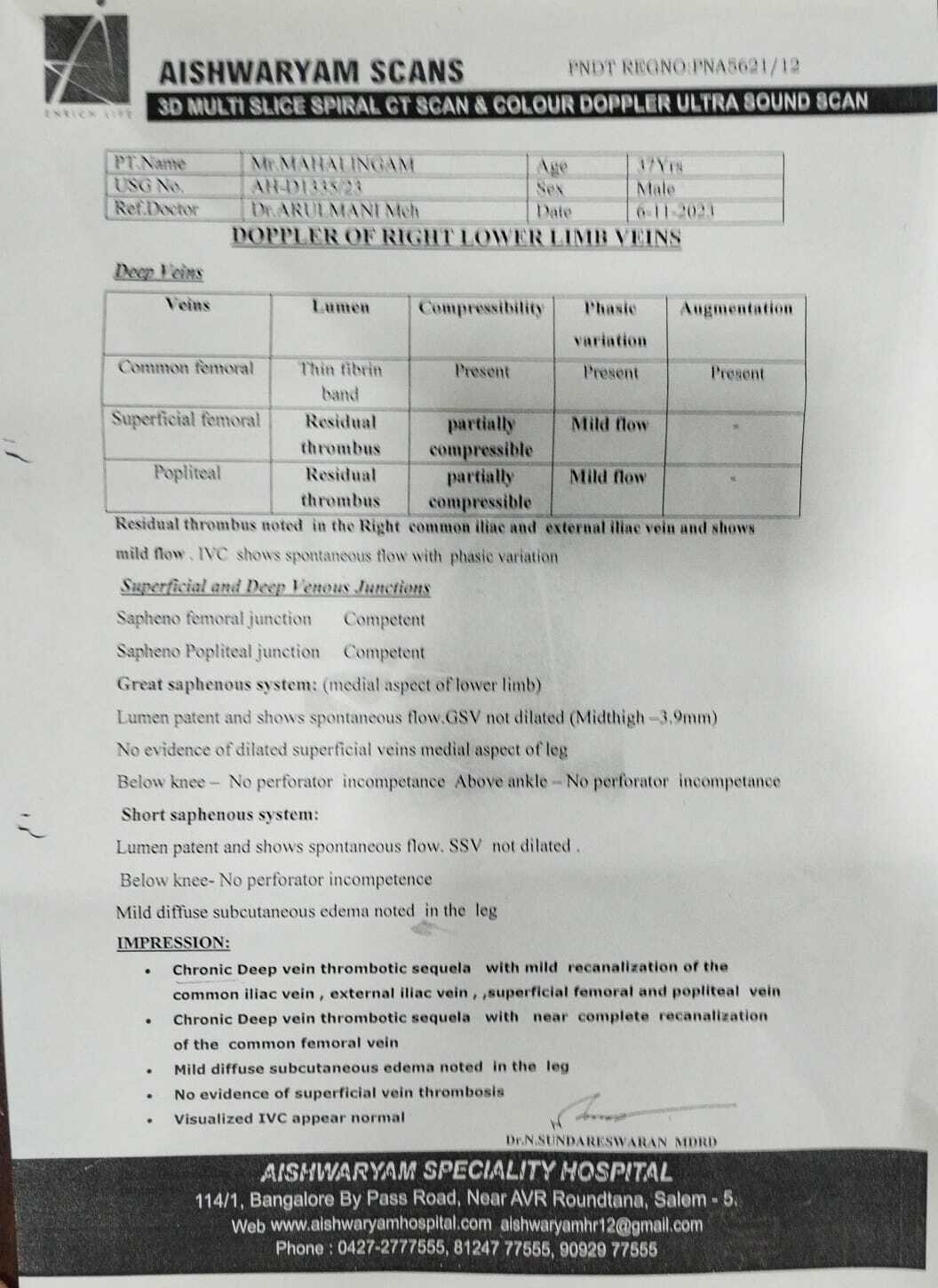 Mr. Mahalingam, 38 years of age, visited our clinic for varicose vein evaluation. After undergoing 100 days of treatment, his condition showed significant improvement. The Doppler report indicates normal vein function with no evidence of deep venous thrombosis, confirming successful recovery after treatment. Reports before and after treatment are enclosed.